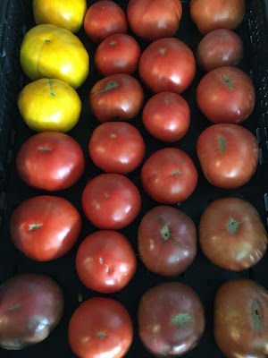 TOMATO: Surprise! Ripe slicing tomatoes in a June share is not the norm. Thank the heat for the early ripening of both the heirloom and hybrid types. The yellow and orange varieties tend to be less acidic than the red and purple tomatoes.