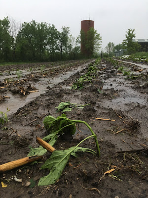 Hail and high winds last week did some damage to the crops here. Most will recover, but we’ve had some setbacks. Expect lighter shares this week as a result. This photo of the onions gives a good representation of the damage.