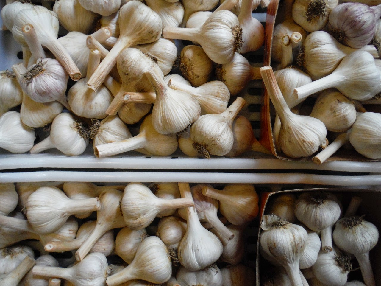 One of the big tasks right now is harvesting the garlic. Once they start to die back in the fields, they need to be pulled while they still have plenty of green leaves. The leaves extend to the heads where they form the layers that protect the cloves and allow the garlic to keep for months.