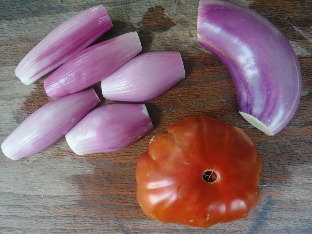 While a bit of a repeat recipe form last week, a combination of our summer vegetables, stewed together with ground beef is quick and delicious. The match of color between the Tropea onions and Dancer eggplant is something that I never quite noticed before, but is yet another thing that makes this a wonderful dish.