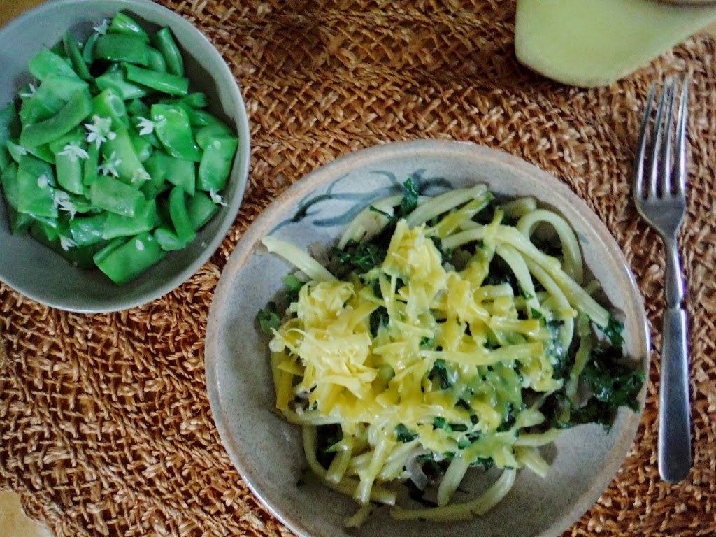 The first is a greens and beans recipe we had a few days ago. We chopped and steamed some roma beans, tossed them with salt, pepper and butter, and then topped it all chive flowers. Meanwhile, in a large saucepan we sautéed onions, garlic and kale. We then tossed it with pasta and topped with grated cheese and sunflower seeds.